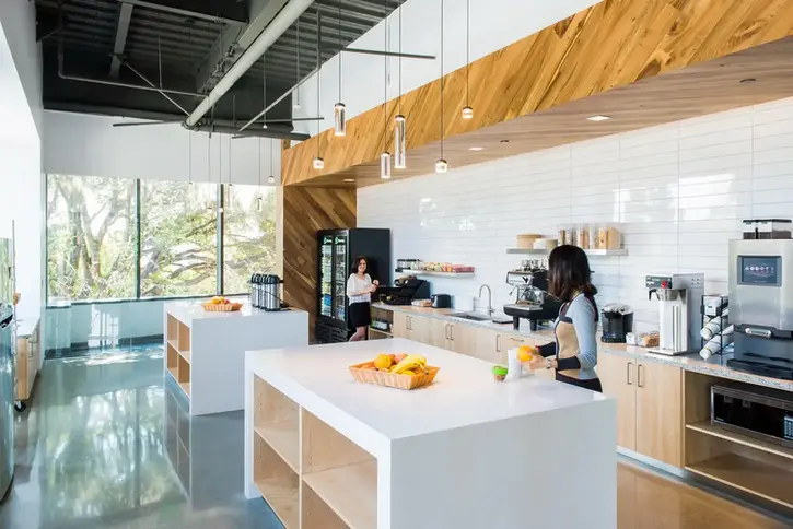 WhatsApp’s need for privacy and efficient design, the bedrock of the app, indicated the space plan's main functions. The largest gathering spaces, a gym and café, were focused on the ground floor, while the remaining upper stories, with a view of tree canopies, were reserved for general office space. This layout allows minimal distractions and keeps bustling activity focused on the ground floor.